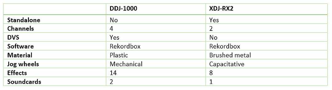 The XDJ-RX2 has capacitative jogs, while the DDJ-1000 has mechanical jogs (like the CDJs). I've played both and, while performing, I'm generally not too picky about which is better. But since I typically perform on CDJ/DJM combos, I choose the DDJ-1000. Additionally, I enjoy the mechanical jogs' beat matching a lot.
